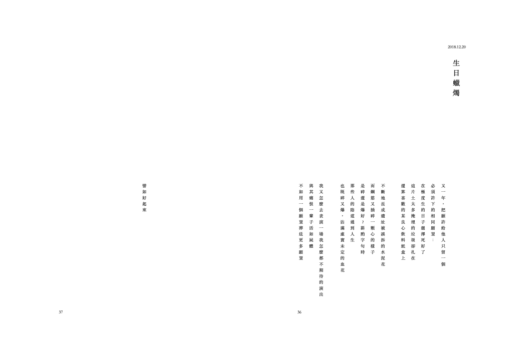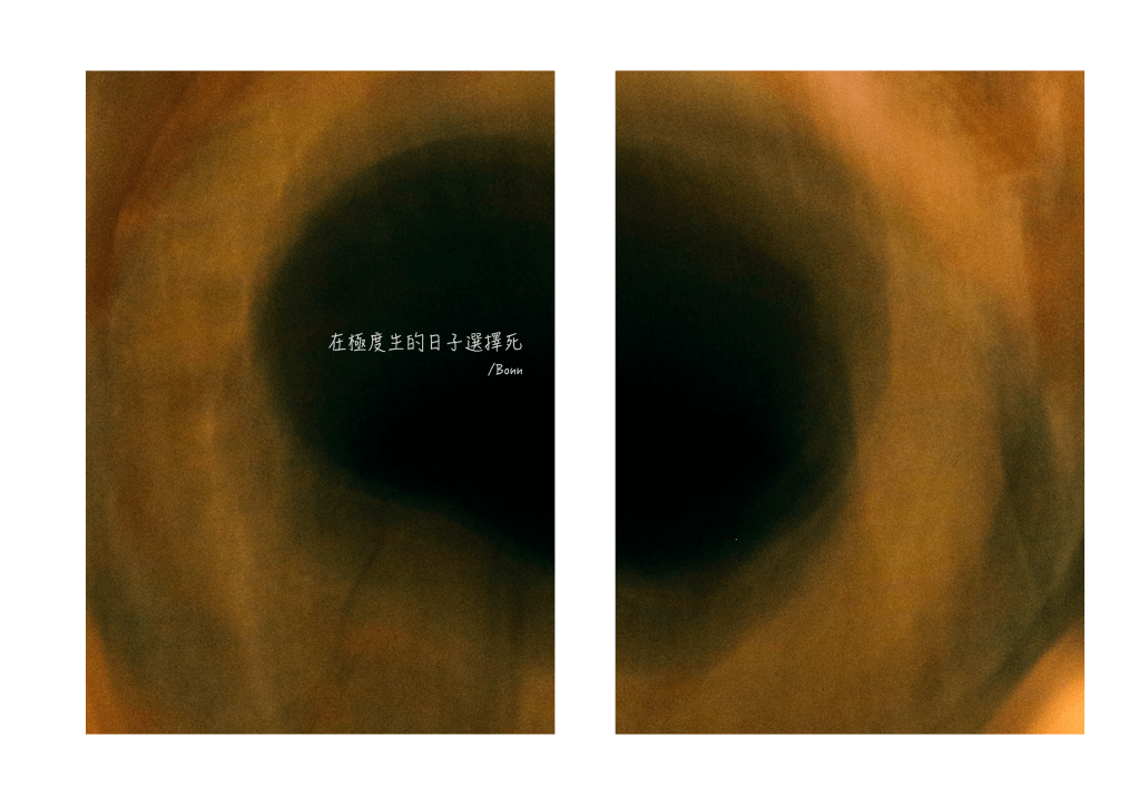 因 2019 一支舞作想在作品裡唸詩,所以誕生了《在極度生的日子選擇死》,只因每一年都想在生日那天離開地球。收錄 2017 至 2019 年所有碎語和影像紀錄,不一定能稱得上詩,不一定能稱得上是攝影。